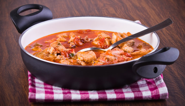 Während die Fischabfälle kochen, kannst du Zwiebeln und Paprika in Streifen schneiden sowie die restlichen Knoblauchzehen und den Peperoni feinhacken. Anschließend werden die Kartoffeln geschält und in feine Scheiben geschnitten. Das Gemüse wird anschließend in erhitztem Öl für 8 – 10 Minuten gedünstet. Nach der Dünstzeit gibst du die geschälten Tomaten in Würfel dazu und würzt mit Salz, Pfeffer und Safran. Anschließend gießt du den passierten Fischfond dazu und lässt alles nochmals für ca. 10 Minuten köcheln.